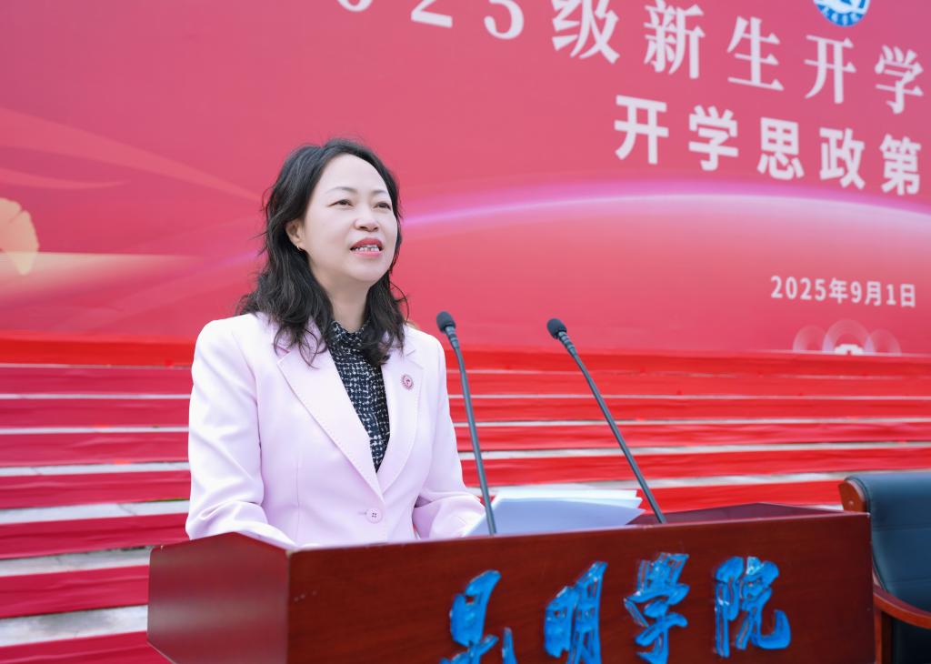 丁文丽致辞,向同学们表示热烈欢迎,并介绍了学校的办学历史和发展成就。她说,2025级的新生们为拥有深厚底蕴的昆明学院注入了最前沿的活力,是学校发展的青春“合伙人”与未来共创者。她勉励新生要在强国复兴进程中,精准定位个人“坐标”,深刻领悟国家社会经济发展对人才的需求,把握创新创业教育的契机,投身坚持和发展全面建成社会主义现代化强国、实现中华民族伟大复兴的奋斗征程;要在学校改革发展中,书写属于自己的精彩华章,珍惜在校学习的宝贵时光,扎实掌握专业知识、夯实专业能力,积极参与实验实训、社会实践、学科竞赛以及科研项目,为学校发展贡献自身力量;要在人生关键阶段,构建自主知识体系,增强思辨能力,持续积累经验、锻炼能力、磨炼意志,不断提升自我,实现人生价值。