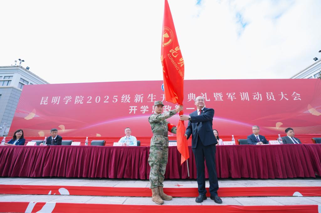 金幼和为昆明学院2025级新生军训团授旗,军训团团长接旗。