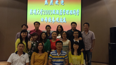 6月26日,旅游学院2003级酒店管理专业毕业生从全国各地欢聚昆明学院洋浦新校园,并在旅游学院酒水实验室举行座谈,共话同学情谊、畅谈母校发展。这是旅游学院举办的本科教育十年回顾总结提升系列活动之一。旅游学院主持工作的副院长田芙蓉、旅游学院党总支副书记杨光明等参加了此次活动。