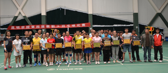 第四届昆明学院教工羽毛球比赛于4月15日至5月19日在学院羽毛球馆举行。本次比赛共设团体赛和单项赛(男双、女双)两个大项,团体赛分甲乙两个组别,有17个分工会组成的21支代表队,120多名教职工参加。单项有74对选手144人参赛。