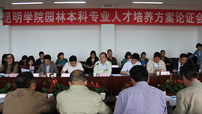 云南省园林行业协会谢亚林会长主持到会专家对我校园林本科专业人才培养方案进行了审议。各位专家围绕专业建设、社会需求从园林本科专业人才培养方案指导思想、目标定位、课程体系建设、学分构成、学时数调整、校企合作人才培养等方面提出了意见和建议。
