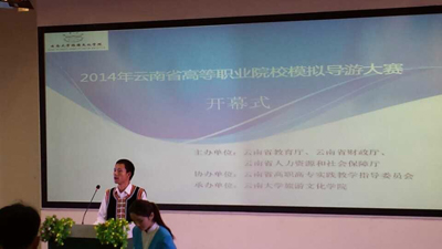 2014年4月底, 由云南省教育厅主办,各高校承办的高等院校职业技能大赛如火如荼展开,在学校教务处的领导下,旅游学院党政领导高度重视,统一部署,由田芙蓉副院长和杨光明副书记带队,积极组织酒店管理教研室和导游教研室的老师对学生进行严格训练和精心备战。经过层层选拔,派出三个参赛队,其中9名学生分别于4月22日参加了由云南旅游职业学院承办的云南省高等院校西式宴会服务技能大赛,4月26日参加了云南大学旅游文化学院承办的“云南省高等院校模拟导游大赛”和云南民族大学职业技术学院承办的“云南省高等院校导游服务技能大赛”三个赛事。