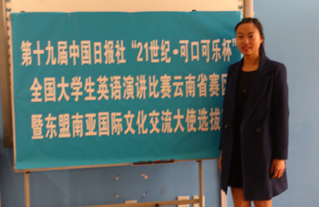 通过激烈竞争,外国语学院2012级商务英语专业学生周颖荣获冠军,并将代表云南省参加3月22-24日在北京举行的全国决赛,和来自全国18个赛区的60余名优秀选手角逐。医学院2012级学生段丹荣获“三星大使”称号,2011级学生赵碧飞、邓云芹和2012级学生巢丽娜荣获“优秀选手奖”。