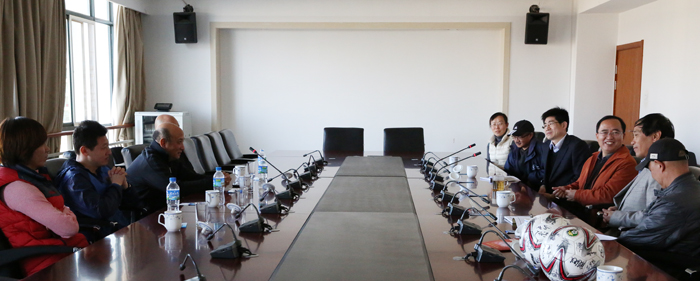 实地察看后,教练组与我校相关领导进行了座谈,就有关合作事谊进行商谈。校长蒋永文对教练组的到来表示欢迎,并诚挚邀请殷教练率队到我校开展训练。他说,学校近年来,在学科专业建设、校园建设、体育运动设施及体育教师队伍建设等方面取得了较大的发展,现正集中精神抓内涵建设。作为学校体育专业发展正需要具有准专业、高水平、有影响的体育运动队伍到校开展合作。蒋校长希望通过专业足球队到校训练,与学生开展互动,普及足球知识、提升足球技能,增强师生对学校的认同感和自豪感;在训练中提升我校足球专业教师实训教学水平;队员与教师开展足球友谊赛,增强体质、凝集力,与专业球员同场竞技分享足球的快乐。殷教练赞誉地说,昆明学院校园很美,体育场馆等设施功能齐全、完备,具备足球运动员训练的条件,加之昆明的气候条件很好,适合队员冬训。他表示,球队到云南训练,昆明学院是比较理想的训练场地。同时,教练组从满足球员训练条件,就我校两块足球场的管养、后勤保障等方面提出了建议。