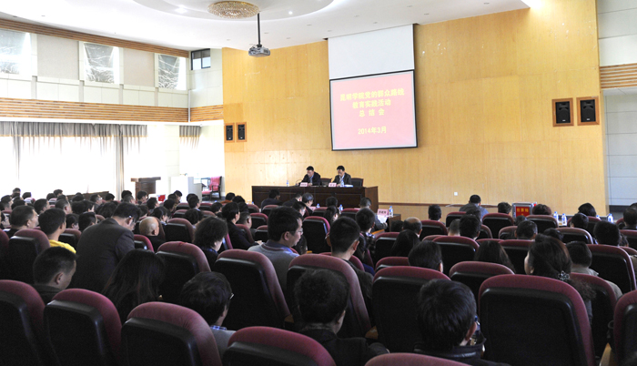 3月4日下午,我校党的群众路线教育实践活动总结会在惟行楼1501报告厅举行。省委第七巡视组副组长高龙,云南师范大学纪委监察室主任盛永红,昆明理工大学宣传部副部长董国军,云南省第一劳动教养管理所副政委、纪委书记苏建海,我校党委领导班子成员,近三年退出党委领导班子的老同志,本校各级党代表、人大代表、政协委员,中层干部(含正副调研员),机关科级以上(含科级)党员干部,学生党支部书记、工会、共青团代表,民主党派主要负责人,师生代表240余人参加了会议。