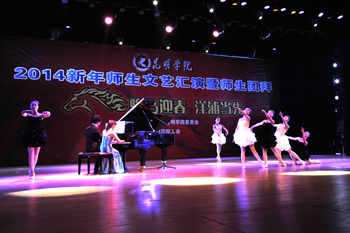为迎接2014年新年的到来,丰富校园文化生活,展现师生风采,凝聚爱校精神,执此辞旧迎新之际,由学校团委、学校工会联合主办的“骏马迎春,洋浦当先”新年师生文艺汇演暨师生团拜活动于12月27日在学生会堂隆重举行。学校校长蒋永文,党委副书记孙勇、李媛芬,副校长李翔、熊晶、刘海发、董建华,校长助理郑克刚,学校全体中层干部、各院系团总支书记、全体辅导员、各院系师生代表1500余人参加了本次活动。