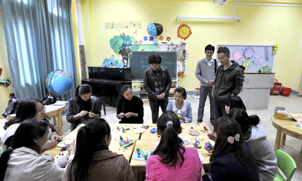会谈结束后,教师教育学院唐敏院长和顾钧博士陪同廖忠博士考察了教师教育学院的实验室。在蒙台梭利教育实训室、幼儿园情境模拟综合实验室、学前儿童感知觉统合实验室,廖忠博士与2013“国培计划”幼儿园骨干教师研修班的学员进行了交谈,询问任课教师的基本情况,得知部分学员来自临沧、德宏等边远地区,而且我校通过让学前教育专业的大四学生以顶岗实习的方式“置换”边远地区一线幼儿园教师参加培训。他对我校开展学前教育与培训的软硬件水平表示满意,对促进我校与加方的合作充满信心。