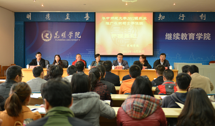 昆明市人才办联络服务处处长吉同枫及我校农学院、经济学院、外国语学院等相关部门领导和华中师范大学2012级农业推广在职硕士学位班全体学员参加了开学典礼。