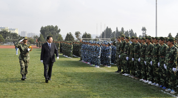 9月13日上午,我校2013级学生军训总结大会在田径运动场隆重举行。学校党委书记陈世波,党委副书记孙勇、李媛芬,副校长李翔、熊晶、刘海发出席大会,武警边防部队士官学校训练部部长李荣等承训部队的领导出席,学校国防教育委员会各成员单位领导以及各院(系)领导、辅导员、军训团教官、2013级参训学生共4900余人参加了总结大会。大会由李翔副校长主持。