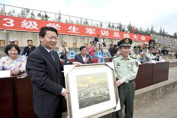 军训科目汇报表演结束之后,学校党委副书记李媛芬宣读了《昆明学院关于表彰2013级军训优秀集体、优秀个人的决定》,对军训活动中表现突出的“内务优秀宿舍”、“军训优秀学员”、“优秀带队教师”和“优秀教官”给予了奖励。陈世波书记代表学校向武警边防部队士官学校赠送了纪念品。数学系2013级金融班赵甜甜同学作为军训优秀学员的代表在大会上作了发言,总结了自己本次军训的收获和感悟,表明了要将军训中学到的优良作风带到新的学习生活中,刻苦学习,努力成才的信心和决心。