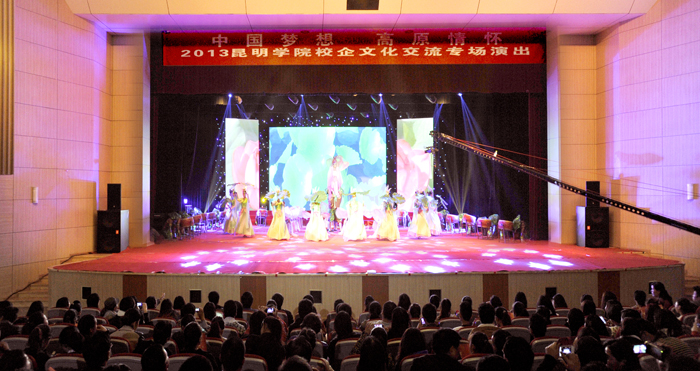 为加强“产教结合、校企合作”,发挥昆明学院和企业的各自优势,共同培养社会与市场需要的人才,达到昆明学院与企业双赢的目的,昆明学院与云南官房地基基础有限公司、昆明中铁大型养路机械集团有限公司、昆明福保集团等合作单位于9月26日晚在昆明学院学生会堂共同举办《中国梦想 高原情怀——2013昆明学院校企文化交流专场演出》。相关单位领导及师生1300多人观看演出。