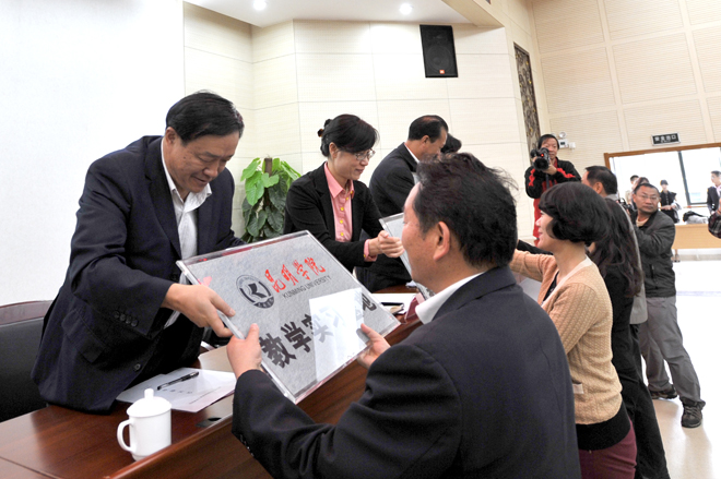 随后举行了授牌仪式。由参会领导向昆明市盲哑学校、盘龙区培智学校、五华区新萌学校授予昆明学院特殊教育专业教学实习基地的牌子,今后这四所学校将成为昆明学院特殊教育专业的首批实习见习基地。