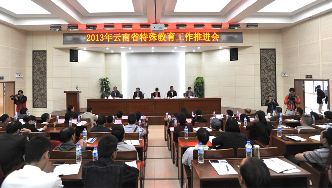 9月4--5日,云南省2013年特殊教育工作推进会在我校办公楼D区报告厅隆重召开。省教育厅副厅长王建颖、省残联副巡视员吴正杰、昆明学院党委副书记孙勇、昆明学院副校长熊晶出席会议。全省各地州(市)分管基础教育的教育局副局长、基础教育科科长,全省特殊学校(含附设特教班)校长,昆明学院教师教育学院、临沧师专的教师等130余名人员参加会议。会议由云南省教育厅基础教育处詹显良副处长主持。