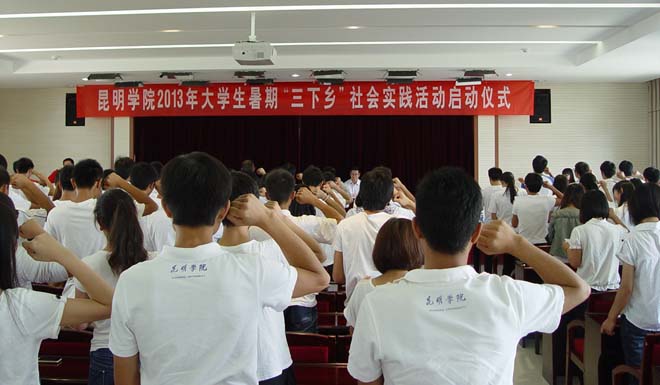 为了深入贯彻落实党的十八大精神和习近平总书记“五四”重要讲话精神,进一步贯彻落实“我的中国梦——云南青年 志在四方”主题教育实践活动的部署和要求,以引导我校青年学生在社会实践中深化对中国梦和“云南精神”的理解认识、确立为实现中国梦、弘扬“云南精神”努力奋斗的志向为重点,鼓励同学们理论联系实际,积极投身社会实践,在基层一线砥砺品质,在同人民群众的密切联系中锤炼作风,在实践中发现新知、运用真知,在解决问题中增长才干,提高大学生的实践能力,学校决定开展昆明学院2013年大学生暑期“三下乡”社会实践活动。今年我校“三下乡”活动以各院系团总支为单位,以项目形式向学校暑期实践活动领导小组申请开展工作,审核通过后共选拔出9支服务队奔赴全省各地开展志愿服务活动。他们分别是:经济学院赴嵩明县经济、法律三下乡社会实践服务团、社会管理学院赴寻甸县文化宣传、政策宣讲社会实践服务团、教师教育学院赴嵩明县教育帮扶社会实践团、信息技术学院赴陆良县科技支农社会实践服务团、自动控制与机械工程学院赴禄丰县科技支农社会实践服务团、城乡建设与工程管理学院赴富民县教育帮扶社会实践服务团、医学院赴寻甸县柯渡镇医疗卫生社会实践服务团、化学科学与技术系赴宜良县爱心支教社会实践团、生命科学与技术系赴小板镇科技支农社会实践服务团。