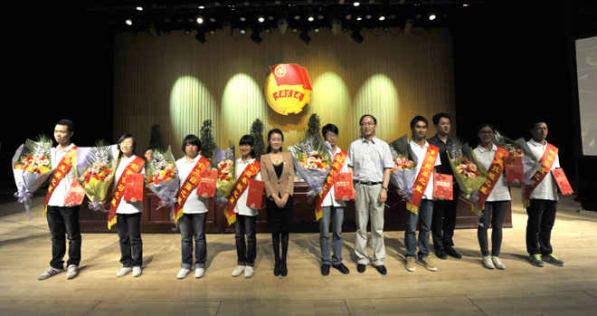 为了鼓励和促进学校青年学生全面发展,增强学生道德品质锤炼和技能特长培养,让学生成为品德好、有特长、肯奉献、能创新的高素质应用型人才,今年学校团委从我校一万余名学生中评选出了9位最闪亮的“青春之星”。他们分别是:全面发展之星——张亮亮、勤奋学习之星——林一婷、自立自强之星——沈丽平、公益奉献之星——武承燕、创新发明之星——张雪涛、创业励志之星——李晓明、素质拓展之星——雷皓、专业技能之星——陶飞艳、社会实践之星——杨义,被授予“青春之星”荣誉称号的同学上台领奖并发表了获奖感言。
