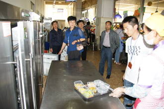 4月23日中午,昆明市经济开发区社会事业局兼卫生局张局长带队的检查组,对我校食堂、餐厅卫生安全工作进行检查指导,后勤集团党总支书记杨平陪同检查。
