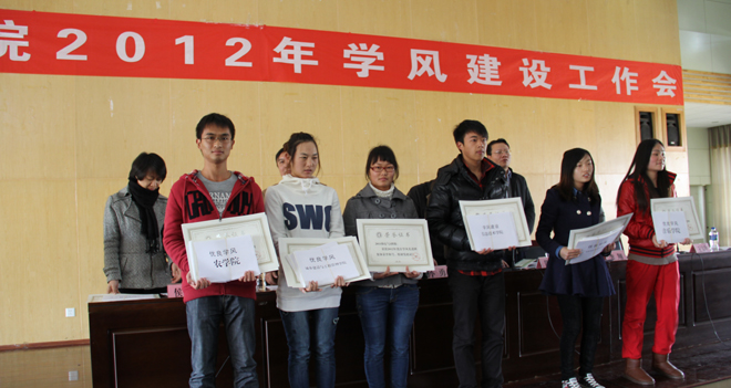 陈世波书记在讲话中指出,我校各职能部门和各院(系)在学风建设中做了大量的工作,学风建设工作整体情况较好,在今年本科教育合格评估中得到了专家的好评,希望今天受表彰的先进集体和先进个人,再接再厉,争取取得更好的成绩。在谈到下一步学风建设工作时,陈书记强调主要要做好以下三项工作:一是学生工作队伍要加强学习。在学习中着重要学好党的十八大精神、学校十二五事业规划和本院(系)的人才培养方案以及学科规划,同时学生干部也要加强学习,在同学中起好模范带头作用。二是各院(系)在开展学风建设工作时要抓党风、带校风、强学风。要注意建设和完善好本单位党内的各项制度,抓好学生党员的教育和管理,真正发挥好学生党员的先锋模范作用。三是在开展学风建设中,要注意抓好考研工作,以此来促进学风的转变。