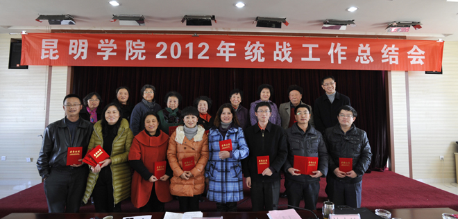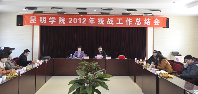 为认真总结2012年统战工作取得的成绩,部署2013年的统战工作, 1月18日下午,昆明学院2012年统战工作总结会在行政办公楼502会议室召开。学校党委副书记李媛芬出席会议,各院系党总支统战委员、各民主党派、侨台联基层组织负责人、无党派人士代表等40余人参加会议。