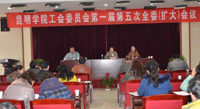 昆明学院工会委员会第一届第五次全委(扩大)会议于1月9日上午隆重召开。全体教代会主席团成员,工会委员,女工委员,经审委员及各分工会主席,机关党总支工会组长,校工会办公室工作人员近70人参加会议,学校党委副书记,纪委书记,校工会主席李媛芬出席会议,会议由校工会副主席刘宇红主持。