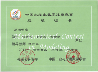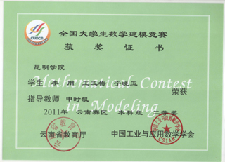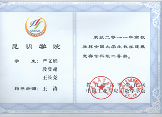 近日,2011年“高教社”杯全国大学生数学建模竞赛组委会公布了竞赛的获奖名次。我校信息技术学院学生取得国家二等奖、云南赛区一等奖和二等奖各1项的优异成绩