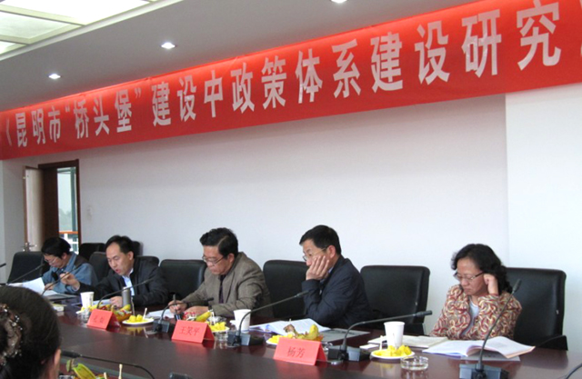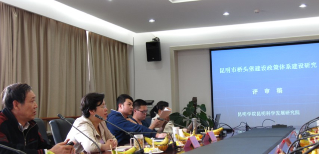 4月11日下午,由昆明市发改委委托昆明学院研究课题《昆明市“桥头堡”建设中政策体系建设研究》专家评审会在我校举行。省政府研究室副主任孔灿,市委政研室主任袁培文,市政府研究室主任王笑平,市社科联主席杨芳,市政府副秘书长、昆明市金融办主任洪维智,昆明市发改委黄建玮处长,以及学校科研处负责人和课题组全体成员,参加了评审会。评审会由科发院黄继元教授主持。