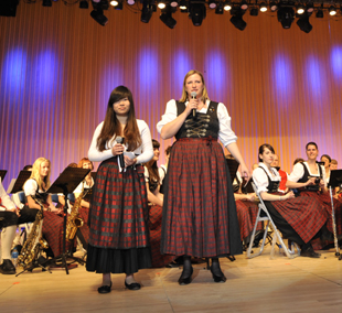 随后,德国慕尼黑Eichenau管乐团为我校师生演奏了安东尼•德沃夏克的《第九交响曲<新世界>》,小约翰•施特劳斯的《皇帝圆舞曲》,居塞比•威尔第的《歌剧<拿布果>序曲》和贝多芬的《欢乐颂》等耳熟能详的经典曲目。欢快的《米老鼠进行曲》和《巴伐利亚民间歌曲》将整场演出推向高潮,应观众的热情要求,乐团加演了5首安可曲目。其中,改编自云南彝族民乐的《阿老表》,熟悉的旋律深深感动现场观众。最后,音乐会在《给予我们和平》的优美旋律中圆满结束,全体观众起立向德国艺术家们的精湛表演致敬并抱以经久不息的掌声。演出结束后,德国艺术家们还亲切地与现场师生合影留念。