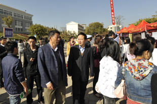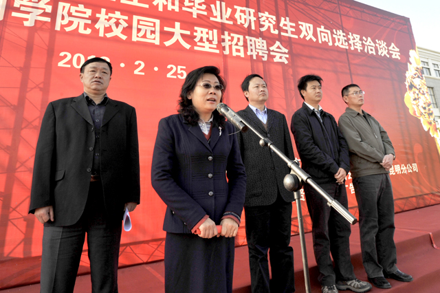孙副书记首先代表昆明学院对出席今天招聘大会的各位领导、各兄弟院校来宾,以及长期以来支持、关心、关注昆明学院建设发展的各协助单位和用人单位表示热烈的欢迎和衷心的感谢。孙副书记从当前国家、省市就业政策、就业形势和我校就业工作开展情况等方面介绍了举办本次就业双向选择洽谈会的目的和意义。孙副书记特别指出:昆明学院始终把促进毕业生充分就业、提升就业质量作为“民心工程”抓紧不放,2011年我校毕业生初次就业率为93.9%,比2010年增长了1.44个百分点;年终就业率为94.13%,比2010年增长了1.56个百分点,入伍预征和自主创业两项重点工作成效显著,圆满完成了全年就业工作目标责任的各项任务。面对2012年新的就业形势和压力,我们认真贯彻落实党中央、国务院和各级政府有关高校毕业生就业工作的决策部署,全力以赴做好高校毕业生就业工作,千方百计促进毕业生充分就业。本次招聘会得到了有关方面的大力支持,多家用人单位到校招聘毕业生,为毕业生提供了大量的就业岗位,为毕业生和用人单位双向选择创造了有利条件。希望各位同学树立信心,展示风采,找到适合自己的岗位;希望各用人单位畅开胸怀,吸纳人才,为毕业生的成长成才提供更为广阔的发展空间;希望学校和协作单位建立长期友好合作,为用人单位与毕业生双向选择与交流搭建良好的平台,实现合作共赢。