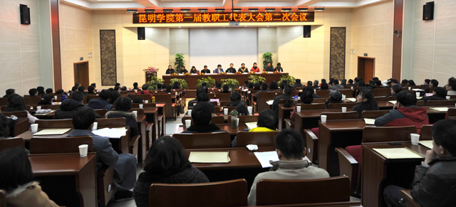 上午9时,在庄严的中华人民共和国国歌声中举行了第一次全体会议。会议由昆明学院党委副书记、纪委书记、工会主席李媛芬主持。第一次全体会议执行主席陈世波、罗明东、孙晓坤、杨斌、郝旭霞、邓先吉、闻欣、毛运昆、聂声在主席台就座。 会议首先听取了校长陈世波所作的《昆明学院2011年行政工作报告》。报告分三个部份,一是学校2011年的主要工作;二是积极解决教职工关心的问题,努力改善福利待遇;三是学校2012年的工作思路和学校“十二五”期间的奋斗目标。
