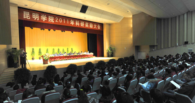 熊晶副校长在主持总结讲话时强调, 今天,我们在这里召开昆明学院2011年科研奖励大会。回顾总结一年来的科研工作,表彰奖励在科学研究中取得突出成绩的教师和学生,安排布置下一步的科研工作,进一步调动广大师生投身科学研究的积极性,着力推动学校科研工作上台阶、上水平。结合学校发展实际和学校“十二五”发展规划的目标,梁书记和陈校长对学校今后的科研工作提出了新的要求,希望同志们认真领会梁书记和陈校长的讲话精神,贯彻落实到日后的科研工作中去,扎实推进学校内涵建设,不断提升学校竞争力和影响力。