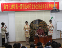 讲座以精彩的茶艺表演开始,刘会长以娴熟的技法为在场的220余名师生表演了沏泡普洱茶。接着,他从“茶”字的来历引出了有关茶的社会功能,同时向同学们阐述了如何冲泡普洱茶、什么是茶文化以及茶叶的药用功能等。讲座最后,刘会长代表昆明茶叶行业协会向昆明学院学生社团联合会赠送了字画,并且一一回答了同学们提出的问题。