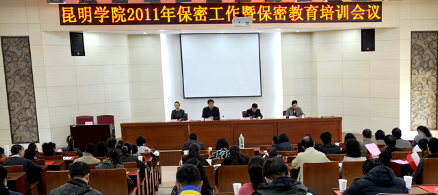 为贯彻落实上级有关文件精神,总结我校上一阶段国家保密工作,安排部署下一步各项工作任务,进一步提高广大干部、涉密人员、教职员工的保密责任意识和遵规守纪的自觉性,学校保密委于11月11日在办公楼三楼报告厅召开昆明学院2011年保密工作总结暨保