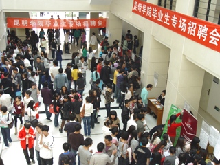 为了认真落实我校关于做好2012届毕业生就业工作的会议精神,切实为2012届毕业生搭好就业平台,我校招就处于10月28日在行政楼D区一楼大厅举办了昆明学院2012届毕业生首场招聘会。