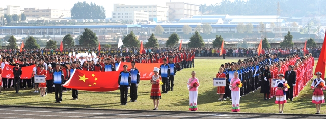 李副校长希望:全体运动员严格遵守竞赛规则,发扬顽强拼搏、团结奋斗的精神,赛出水平、赛出风尚、赛出个性、赛出友谊;裁判员要严守规程,坚持原则,公正裁判;广大师生要通过体育运动,更加热爱健康生活,走出网吧、走出酒吧,走进运动场、走进阳光里,以振奋的精神和健康的体魄投入工作、学习和生活,全面促进学校更好更快发展。 随后运动员代表、裁判员代表分别代表本次运动会2000余名运动员、100余位裁判员宣誓。 学校党委副书记、组委会副主任孙勇激情宣布:昆明学院2011年运动会开幕。 运动员、裁判员有序退场后,师生70余个竞赛项目按计划逐项鸣枪开赛。