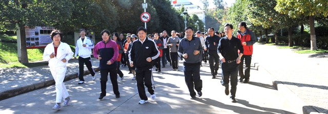 10时许,在聂耳广场还举行了“昆明学院教工文化协会(俱乐部)成立暨2011年教工运动会”教职工环校园跑项目起跑仪式。党委副书记李媛芬发令,在党委副书记孙勇、副校长李翔等校领导的领跑下,全校1500余名教职工开始了环校园跑。充分展示了全体教职员工热爱生活、热爱学校、热爱教育、热爱学生,追求健康,团结一心,把校园当家园建设,把学生当自己的孩子来培养。