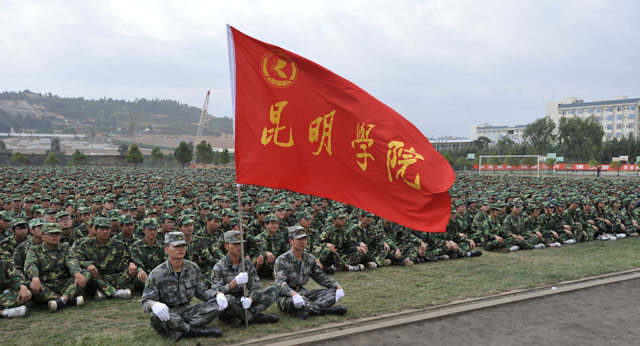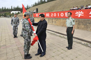 随后,昆明学院、昆明陆军学院领导向军训团授旗,标志着2010级学生为期11天的军训生活正式拉开帷幕。 接着,参训学生代表城建学院胡健同学代表全体受训同学表达了刻苦训练,服从命令,令出即行,禁下即止,团结友爱,克服困难的决心。教官陈超代表全体教官郑重承诺:认真完成军训任务,严格训练,提高学生的素质。 昆明陆军学院军训办主任朱平大校在军训开训动员大会上作了动员讲话,他希望同学们培养吃苦耐劳、勇于拼搏、战胜自我的顽强作风。同时,以“兵”的标准严格要求自己,听从教官的指挥,服从管理,保质保量完成军训任务。