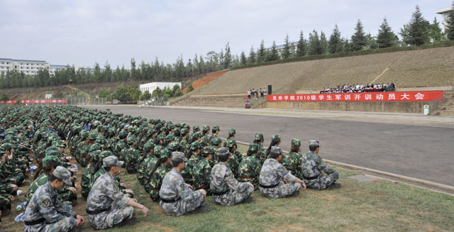 6月25日上午,我校运动场上隆重举行了2010级学生军训开训动员大会。昆明陆军学院军训办主任朱平大校、副主任田景大校,我校孙勇副书记、熊晶副校长、学生处吴蓉处长、后勤处冯坚处长、宣传部沈中灿副部长、学生处晁丽华副处长、教务处王韬副处长、各院(系)分管学生工作的领导及辅导员、2010级4646名学生参加了开训动员大会。开训动员大会由熊晶副校长主持。