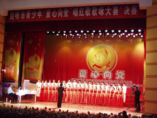 | 在中国共产党成立90周年之际,由云南省关工委、昆明市关工委、昆明市教育局等单位联合举办的昆明市青少年“童心向党”唱红歌歌咏大赛于5月28日落下帷幕。昆明学院音乐学院合唱队代表我校关工委参加最后的总决赛,最终获得本届大赛艺术贡献奖、优秀组织奖,张新、张忠两位老师荣获指导老师奖。