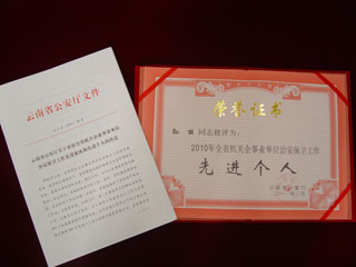 近日,云南省公安厅对2010年全省机关企业事业单位内部治安工作进行表彰,昆明学院保卫处再次获得“全省机关企业事业单位治安保卫工作先进集体”称号;保卫处副处长孙丽同志获得“全省机关企业事业单位治安保卫工作先进个人”称号(云公治[2011]46号)。这是保卫处在云南省公安厅对全省企业事业内部单位治安工作表彰中第三次蝉联该项荣誉称号。