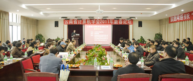 | 1月15日下午,云南省计算机学会2011年新春论坛在我院隆重召开。论坛由云南省计算机学会主办,昆明学院承办,昆明雷神科技发展有限公司、福建星网锐捷网络有限公司、北京博创兴业科技有限公司及昆明时育物科技有限公司协办。论坛由云南省计算机学会第七届理事会秘书长、云南大学信息学院副院长张学杰教授主持。我院副院长罗明东教授、云南省计算机学会全体理事、我院计算机与网络技术系全体领导、现代教育技术中心领导及特邀嘉宾共100名代表出席了此次论坛。