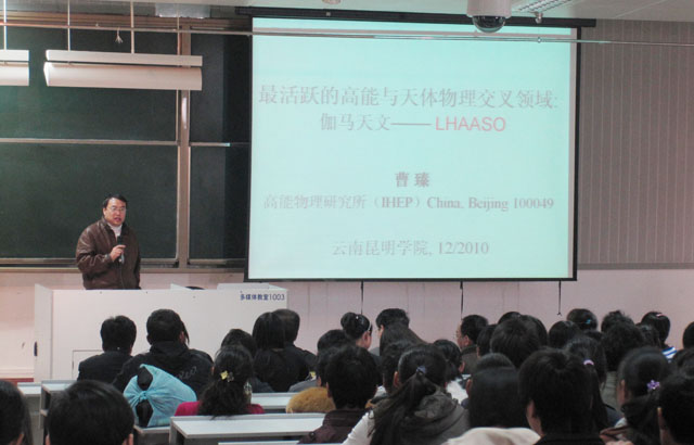 12月23日下午, 物理科学与技术系邀请到中国科学院高能物理研究所粒子天体物理中心博士生导师曹臻研究员到我院作了题为 “最活跃的高能与天体物理交叉领域:伽马(γ)天文——LHAASO”的学术讲座。昆明学院陈世波院长出席了讲座,物理科学与技术系党政领导戴祖诚、赵庆江、何松林,全系师生以及外系一些感兴趣的同学300余人一起认真聆听了曹研究员的精彩演讲。系主任戴祖诚主持讲座。