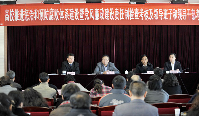 省委高校工委第五考核组副组长、保山学院党委副书记杨耀程同志就省委高校工委对我院推进惩治和预防腐败体系建设暨党风廉政建设责任制及班子和领导干部进行年度考核作动员讲话。杨副组长指出,此次检查考核是根据省委高校工委的统一部署和要求,在全省高校范围内开展的。第五组对昆明学院检查考核的主要内容是了解昆明学院党政领导班子和班子成员党风廉政建设责任制的执行情况,纪检监察部门落实党风廉政建设责任制,推进惩治和预防腐败体系建设工作情况。检查考核是为了促进高校对党风廉政建设工作开展,总结推广各高校的特色经验,促进全省高校党风廉政建设工作的共同发展。 杨副组长强调,大家要以自查和检查考核为契机,深入推进以完善惩治和预防腐败体系为重点的反腐倡廉建设;要严格执行党风廉政建设责任制,加快推进惩治和预防腐败体系建设,认真落实反腐倡廉各项工作任务;坚决查处违纪违法案件,严肃纠正损害群众利益的不良之风,加强党性党风党纪教育和领导干部廉洁自律工作,深入推进领导干部作风建设;要健全权力运行制约和监督机制,进一步巩固和深化反腐倡廉制度建设成果,最大限度减少腐败现象滋生的土壤和条件。
