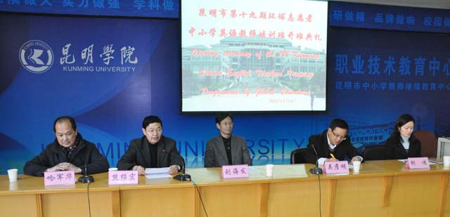 2011年新年伊始,昆明学院昆师路校区职教中心迎来了本年度的第一批美国环球志愿者,这是环球志愿者第十九次到我院培训英语教师。本批志愿者多数是美国的大学或中学教师,他们将在我院无偿服务两周,为来自昆明市的62名小学和幼儿园教师教授英语口语和英语教学法。