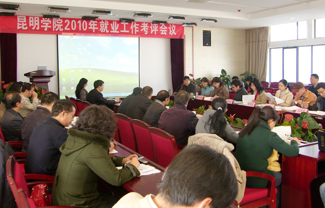 会议由招就处副处长杨跃主持。杨跃副处长主要阐明了就业工作考评会议的意义和重要性,重点说明了考评的方式和具体要求。各系部按照与学院签订的《昆明学院2010年毕业生就业工作目标责任书》的要求,依据会前抽签顺序,以PPT形式汇报2010年就业工作情况。整个考评会议在紧张、有序、高效的氛围中顺利完成。