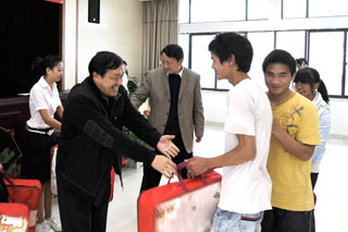陈世波院长语重心长地对贫困生提出了要求和希望,他强调:党和政府以及学院一直关心着家庭经济困难学生,从国家助学贷款到国家励志奖学金、国家助学金、云南省政府励志奖学金到昆明学院励志奖学金等各级各类助奖学金,都给予了家庭经济困难学生极大的帮助。希望通过此次发放御寒物品把党、政府、学院对家庭经济困难学生的关心和爱护传递到学生心中。他表示凡是刻苦努力、勤奋学习的学生,党、政府以及学院一定不会放弃你们,一定会想尽一切办法帮助你们渡过难关。