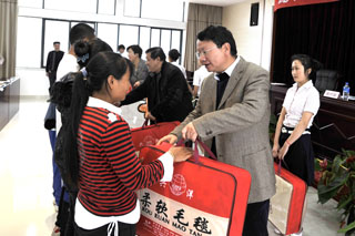 接着,陈世波院长、孙勇副书记、熊晶副院长在活动现场向贫困生一一发放了御寒物品,与会领导边发放,边亲切询问了同学们的学习和生活近况。