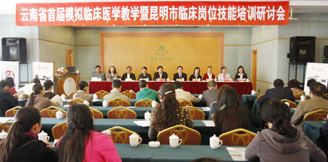 我院医学院与昆明市护理学会、云南省中等医学教育研究室共同主办了云南省首届医学模拟教学暨昆明市临床岗位技能培训研讨会,会议于2010年10月23日开幕,由医学院主持工作副院长余珊致开幕词,昆明学院主管教学副院长罗明东出席会议并讲话。