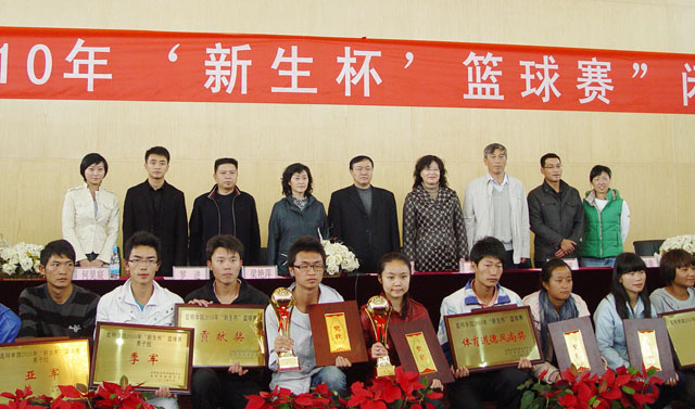 孙勇副书记老师致闭幕辞,他指出:本次“新生杯”篮球赛是一次团结的比赛,一次和谐的比赛,充分展示了我院大学生积极进取、奋发向上、勇攀高峰的昂扬斗志,是建设和弘扬校园特色文化的一个重要载体,是提高学生体能素质的重要途径。目前,我院正处在高速发展的新时期,正在积极探索校园文化建设的新方向,“新生杯”篮球赛是校园精神文明建设的一个重要组成部分,是建设良好校风、全面推进素质教育的重要环节,是学生意志品质和综合素质的重要体现,也是学生自身成长成才的需要。大学生的全面发展,应当是包括身体素质在内的各方面素质的和谐发展。学校培养的人才不仅应该具有高尚的品德,渊博的学识,创新的精神,更应该拥有强健的体魄。我们要重视体育锻炼,要懂得增强自身的身体素质是事关我们人生规划的大事。希望同学们将“更高、更快、更强”的运动精神带到今后的学习和生活中去,以饱满的热情、昂扬的斗志、拼搏的精神去迎接人生的挑战。 本届“新生杯”篮球赛历时一个多月,共计74场比赛,经过激烈角逐,最终经济系、文新系、计网系女子队荣获女队前三甲;城建系、自机系、经济系男子队荣获男队前三甲;体育系荣获“贡献奖”;生科系荣获“体育道德风尚奖”。 本次比赛参与面广、实践性强,为我院大学生搭建了一个锻炼和展示自我的平台,增加了各系部之间的交流,调动了广大同学参与体育活动的积极性。希望全院同学在明年“新生杯”篮球赛上积极参与,再创佳绩!