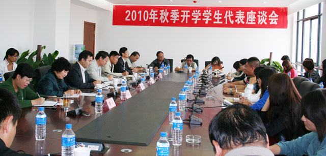 为充分利用、发挥学院现有资源,向师生提供快捷、方便、安全、舒适、优质的学习、生活校园环境,不断改善、提升学院教学质量和校园服务水平,全面听取广大学生的意见和建议,9月26日,“昆明学院2010年秋季开学学生代表座谈会”在新校园办公楼311会议室举行。学院党委书记梁晓谷、院长陈世波、副书记李媛芬,副院长张寿国、熊晶、刘海发出席座谈会,学院相关职能部门负责人和21个教学院、系的学生代表参加了座谈会。座谈会由陈世波院长主持。 座谈会在轻松、和谐的氛围中进行,各位学生代表以“我与学院同成长”的主人翁精神踊跃发言,并一致表示:身为昆明学院的学生,为学院今天的改革发展所取得的成绩感到自豪,为如期迁入新校园实现梦想中美丽、舒适的现代化大学校园而骄傲。学生代表就学院教学、学习、生活、服务等方面提出了许多宝贵的意见和建设,内容涉及学生后续教育考研,加强体育、音乐系学生外语等基础知识的扩展,图书馆藏书量与图书内容更新,校园“一卡通”与网络建设,师生就餐环境和服务质量,校园安全,校园文化活动场地等意见和建议。