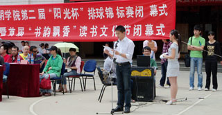 4月30日下午,昆明学院第二届“阳光杯”排球锦标赛暨首届“书韵飘香”大学生读书文化节闭幕式在我院人民西路校区篮球场正式举行。出席此次闭幕式的领导及嘉宾有机关党总支书记梁艳萍老师、学生处处长吴蓉老师、团委书记何昊宸老师、团委副书记钱海鼎、王海艳老师以及各系团总支书记。