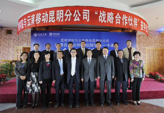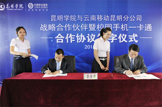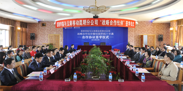 4月28日下午,昆明学院与云南移动昆明分公司“战略合作伙伴”暨校园手机一卡通签字仪式在我院人民西路校区3号教学楼6楼多功能厅举行。